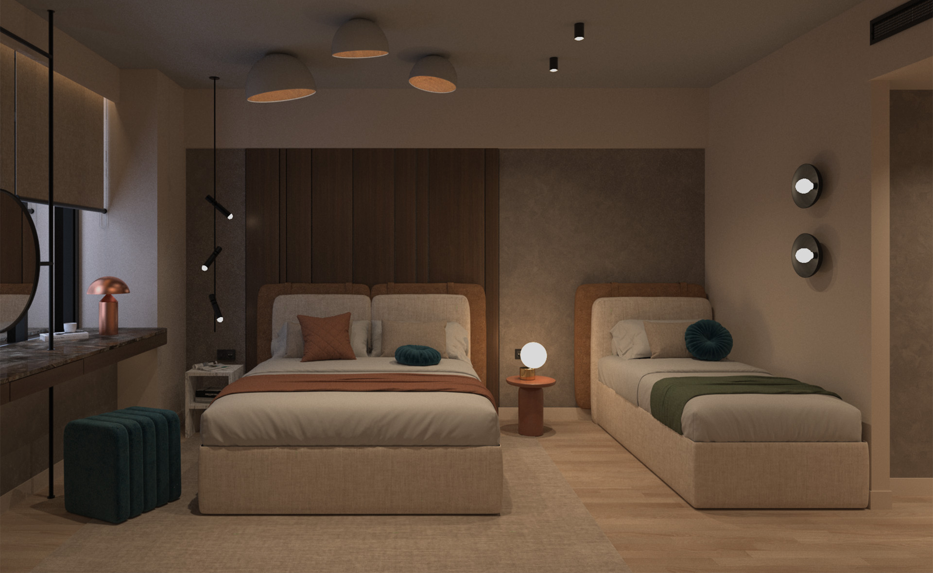 The room includes 1 double bed and 1 single bed, with the option to configure it into 3 single beds upon request — ideal for accommodating up to 3 guests.